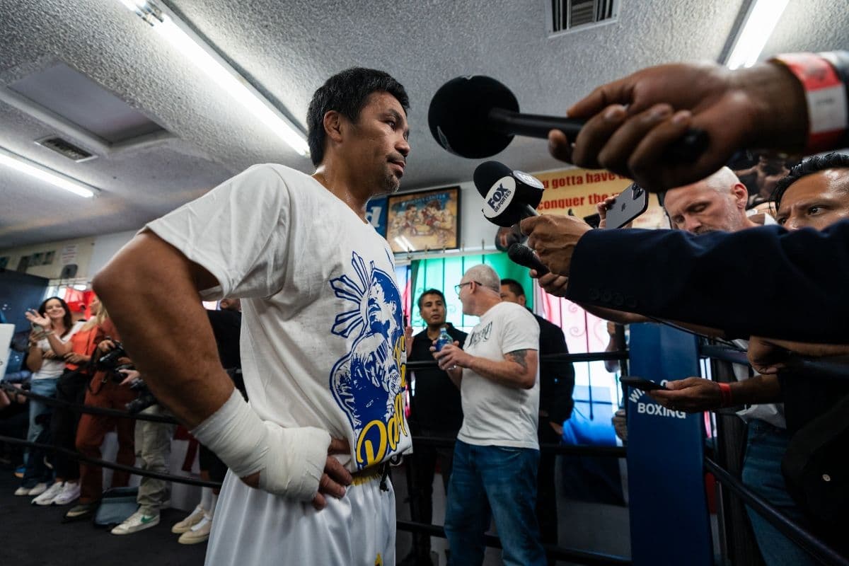 International Boxing Hall of Famer Manny “Pacman” Pacquiao held a media workout in Los Angeles on Wednesday, along with his trainer, fellow Hall of Famer Freddie Roach, as he prepares to challenge WBC Welterweight World Champion Mario “El Azteca” Barrios headlining a star-studded PBC Pay-Per-View event on Prime Video on Saturday, July 19 from the MGM Grand Garden Arena in Las Vegas. (photos by Ryan Hafey.
